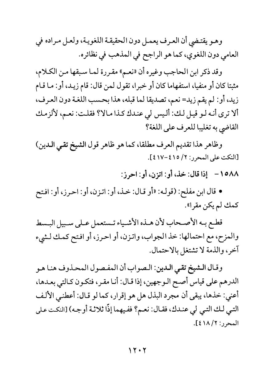 وقد ذكر ابن الحاجب وغيره أن «نعم» مقررة لما سبقها من الكلام، مثبتا كان أو منفيا، استفهاما كان أو خبرا، تقول لمن قال: قام زيد، أو: ما قام زيد، أو: لم يقم زيد= نعم، تصديقا لما قبله، هذا بحسب اللغة دون العرف، ألا ترى أنه لو قيل لك: أليس لي عندك كذا مالا؟ فقلت: نعم، لألزمك القاضي به تغليبا للعرف على اللغة؟