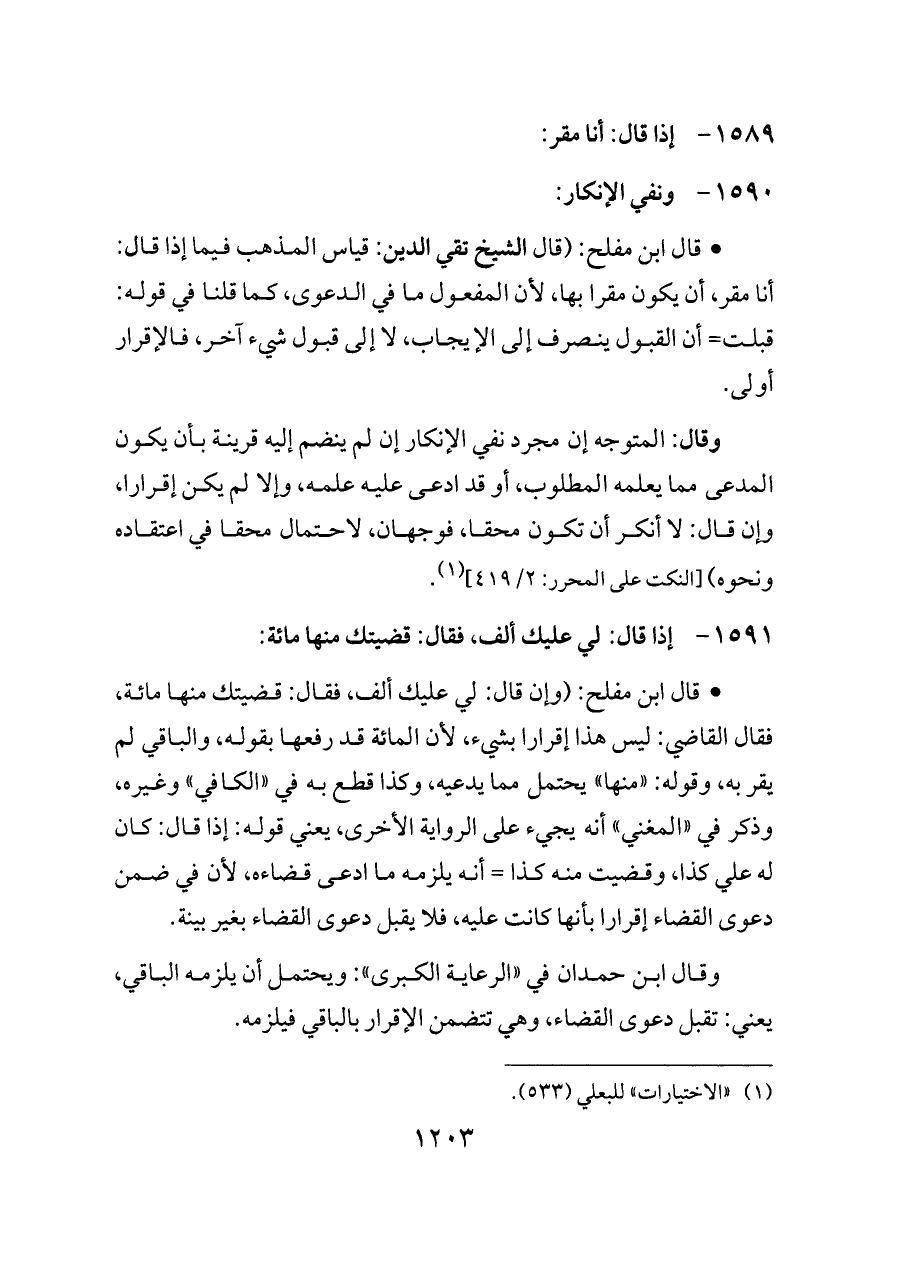 - قال ابن مفلح: (وإن قال: لي عليك ألف، فقال: قضيتك منها مائة، فقال القاضي: ليس هذا إقرارا بشيء، لأن المائة قد رفعها بقوله، والباقي لم يقر به، وقوله: «منها» يحتمل مما يدعيه، وكذا قطع به في «الكافي» وغيره، وذكر في «المغني» أنه يجيء على الرواية الأخرى، يعني قوله: إذا قال: كان له علي كذا، وقضيت منه كذا = أنه يلزمه ما ادعى قضاءه، لأن في ضمن دعوى القضاء إقرارا بأنها كانت عليه، فلا يقبل دعوى القضاء بغير بينة.