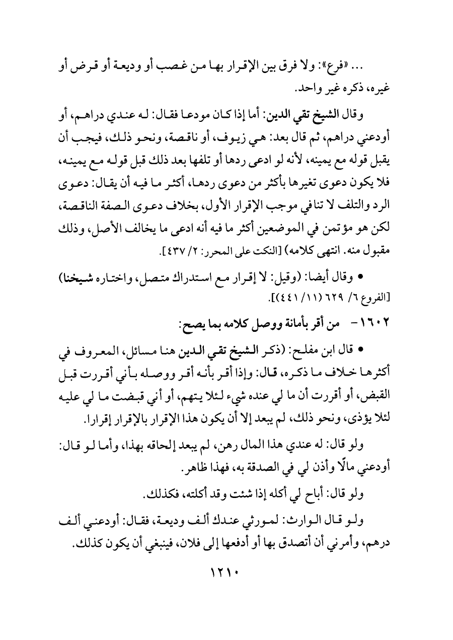 - وقال أيضا: (وقيل: لا إقرار مع استدراك متصل، واختاره شيخنا) [الفروع ٦/ ٦٢٩ (١١/ ٤٤١)].