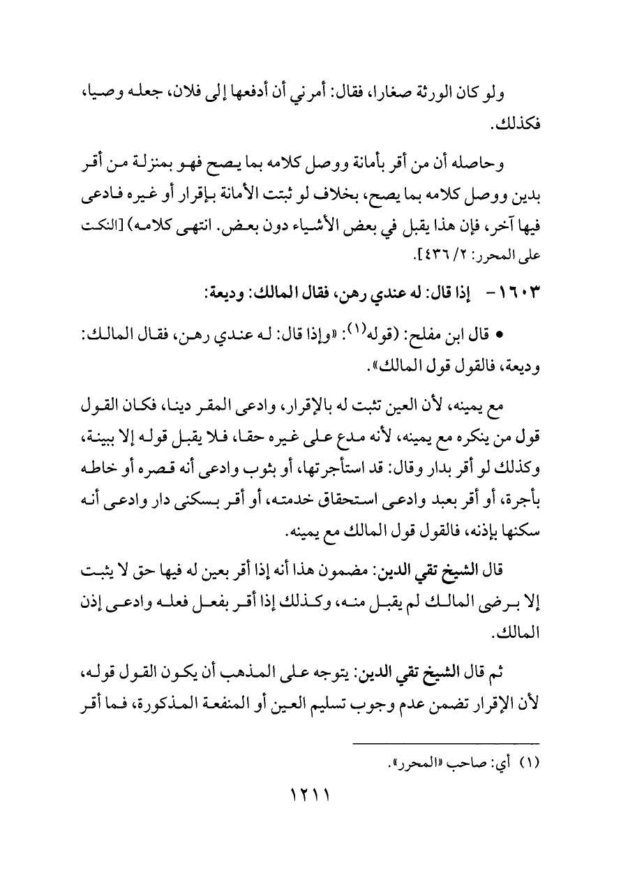 وحاصله أن من أقر بأمانة ووصل كلامه بما يصح فهو بمنزلة من أقر بدين ووصل كلامه بما يصح، بخلاف لو ثبتت الأمانة بإقرار أو غيره فادعى فيها آخر، فإن هذا يقبل في بعض الأشياء دون بعض. انتهى كلامه) [النكت على المحرر: ٢/ ٤٣٦].