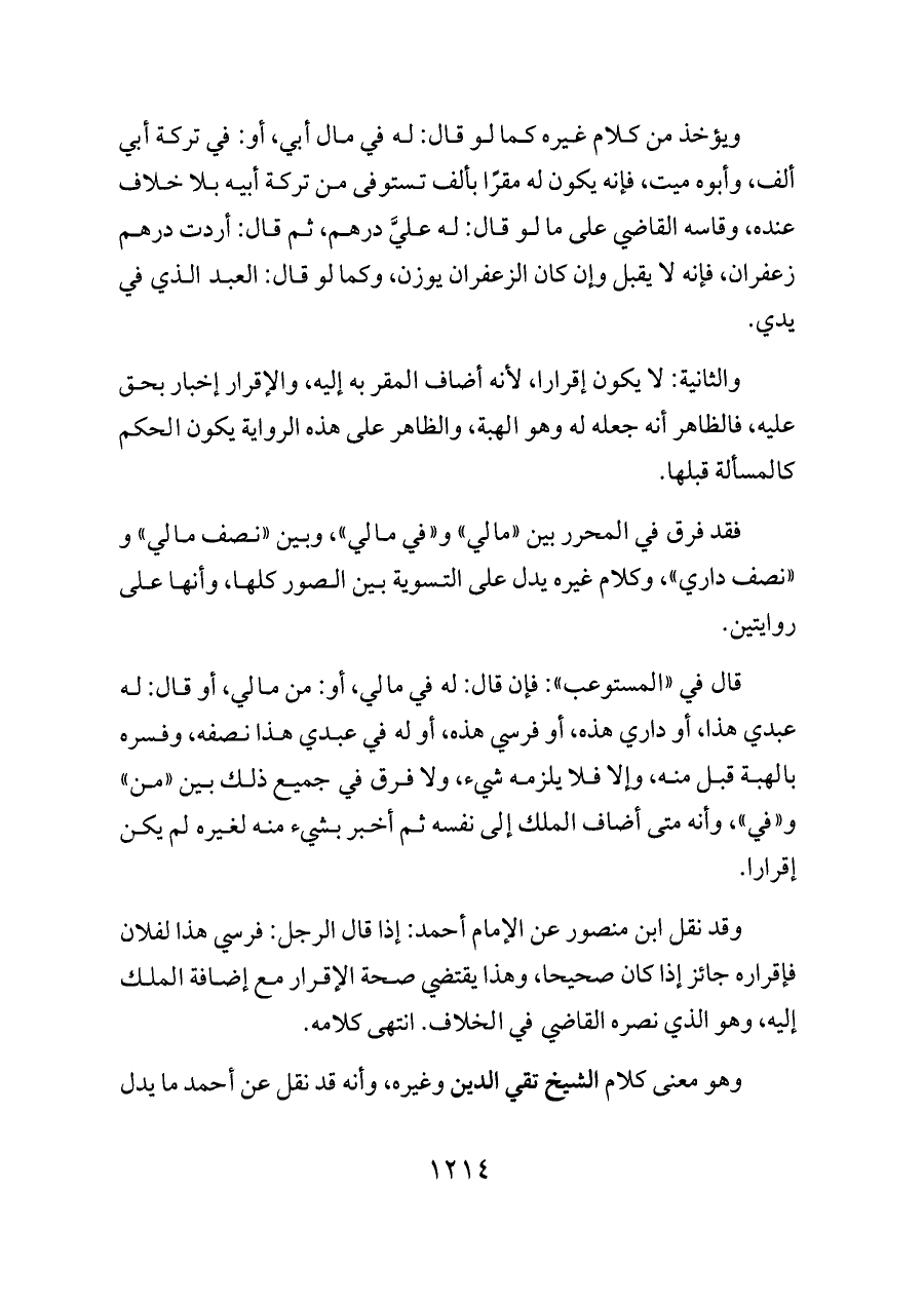 وقد نقل ابن منصور عن الإمام أحمد: إذا قال الرجل: فرسي هذا لفلان فإقراره جائز إذا كان صحيحا، وهذا يقتضي صحة الإقرار مع إضافة الملك إليه، وهو الذي نصره القاضي في الخلاف. انتهى كلامه.