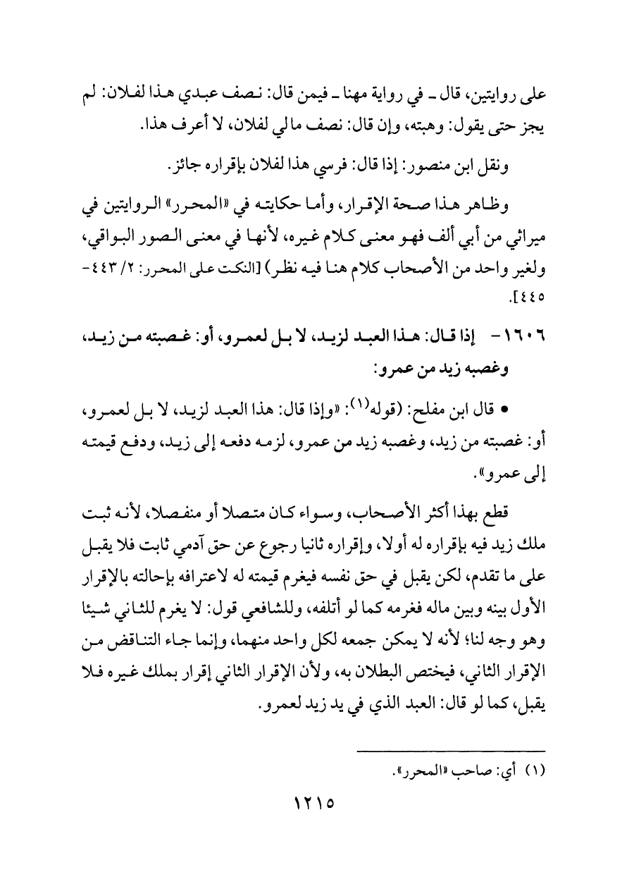- قال ابن مفلح: (قوله (¬١): «وإذا قال: هذا العبد لزيد، لا بل لعمرو، أو: غصبته من زيد، وغصبه زيد من عمرو، لزمه دفعه إلى زيد، ودفع قيمته إلى عمرو».