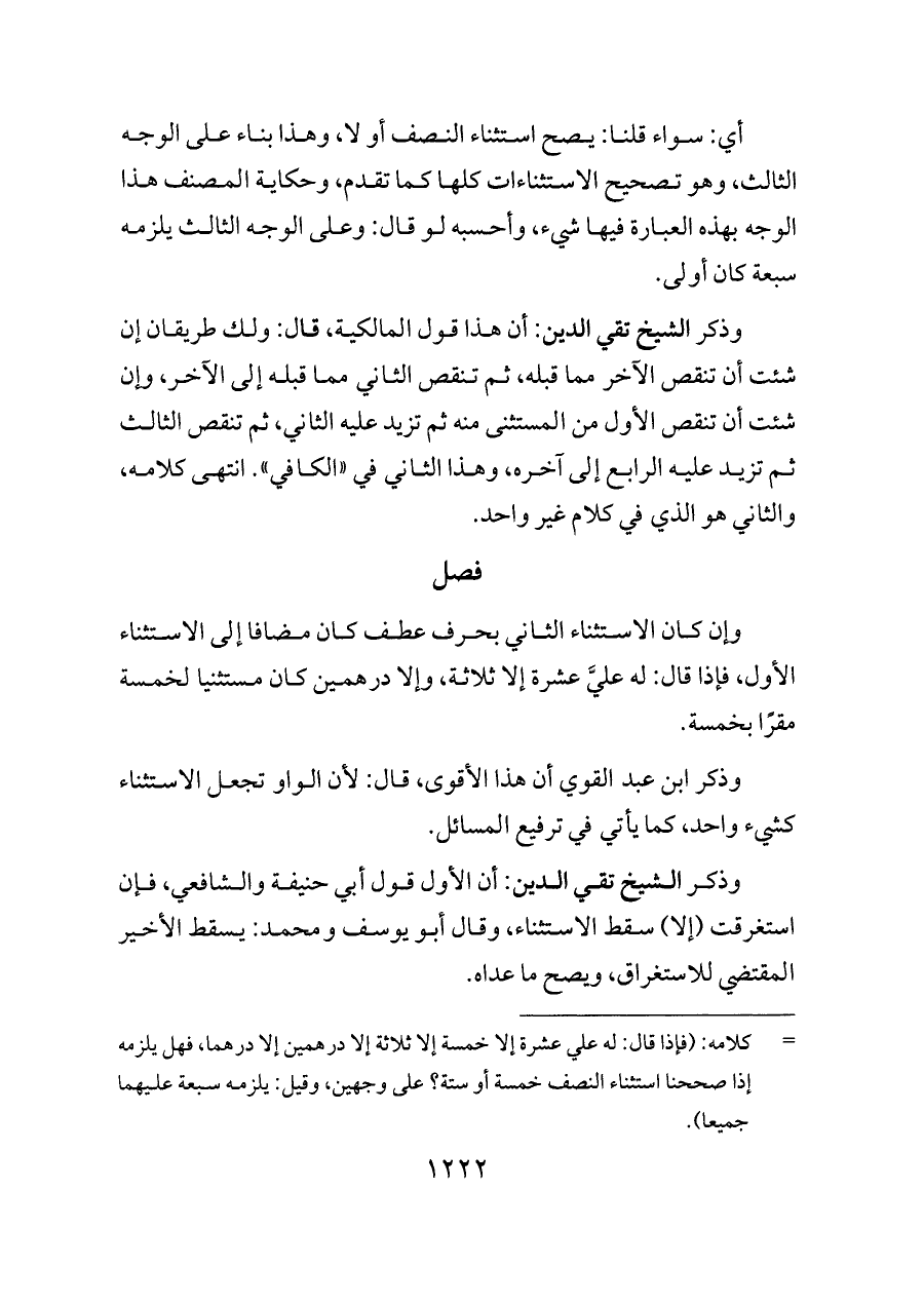 وذكر الشيخ تقي الدين: أن هذا قول المالكية، قال: ولك طريقان إن شئت أن تنقص الآخر مما قبله، ثم تنقص الثاني مما قبله إلى الآخر، وإن شئت أن تنقص الأول من المستثنى منه ثم تزيد عليه الثاني، ثم تنقص الثالث ثم تزيد عليه الرابع إلى آخره، وهذا الثاني في «الكافي». انتهى كلامه، والثاني هو الذي في كلام غير واحد.