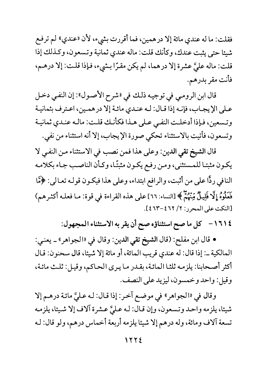 فقلت: ما له عندي مائة إلا درهمين، فما أقررت بشيء، لأن «عندي» لم ترفع شيئا حتى يثبت عندك، وكأنك قلت: ماله عندي ثمانية وتسعون، وكذلك إذا قلت: ماله عليَّ عشرة إلا درهما، لم يكن مقرًا بشيء، فإذا قلت: إلا درهم، فأنت مقر بدرهم.