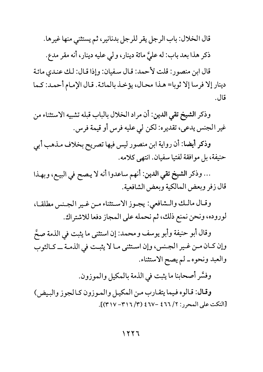وذكر الشيخ تقي الدين: أن مراد الخلال بالباب قبله تشبيه الاستثناء من غير الجنس يدعى، تقديره: لكن لي عليه فرس أو قيمة فرس.