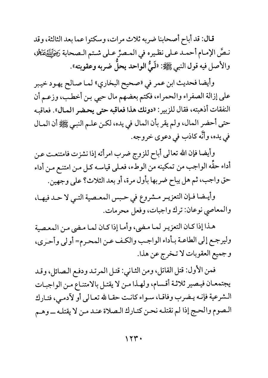 قال: قد أباح أصحابنا ضربه ثلاث مرات، وسكتوا عما بعد الثالثة، وقد نصَّ الإمام أحمد على نظيره في المصرِّ على شتم الصحابة - رضي الله عنهم -، والأصل فيه قول النبي - صلى الله عليه وسلم -: «لَيُّ الواحد يحلُّ ضربه وعقوبته».