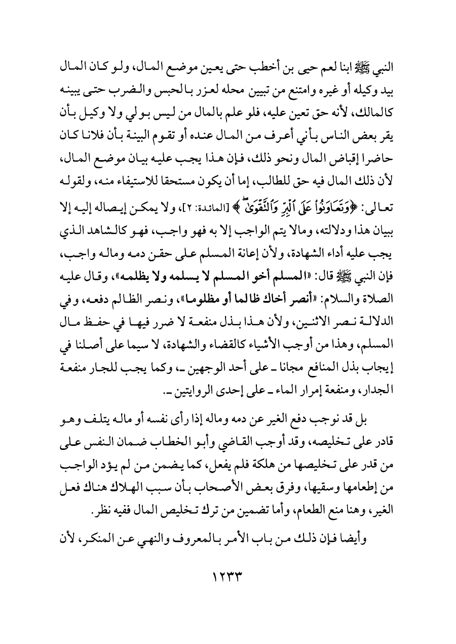 النبي - صلى الله عليه وسلم - ابنا لعم حيى بن أخطب حتى يعين موضع المال، ولو كان المال بيد وكيله أو غيره وامتنع من تبيين محله لعزر بالحبس والضرب حتى يبينه كالمالك، لأنه حق تعين عليه، فلو علم بالمال من ليس بولي ولا وكيل بأن يقر بعض الناس بأني أعرف من المال عنده أو تقوم البينة بأن فلانا كان حاضرا إقباض المال ونحو ذلك، فإن هذا يجب عليه بيان موضع المال، لأن ذلك المال فيه حق للطالب، إما أن يكون مستحقا للاستيفاء منه، ولقوله تعالى: {وَتَعَاوَنُوا عَلَى الْبِرِّ وَالتَّقْوَى} [المائدة: ٢]، ولا يمكن إيصاله إليه إلا ببيان هذا ودلالته، ومالا يتم الواجب إلا به فهو واجب، فهو كالشاهد الذي يجب عليه أداء الشهادة، ولأن إعانة المسلم على حقن دمه وماله واجب، فإن النبي - صلى الله عليه وسلم - قال: «المسلم أخو المسلم لا يسلمه ولا يظلمه»، وقال عليه الصلاة والسلام: «أنصر أخاك ظالما أو مظلوما»، ونصر الظالم دفعه، وفي الدلالة نصر الاثنين، ولأن هذا بذل منفعة لا ضرر فيها في حفظ مال المسلم، وهذا من أوجب الأشياء كالقضاء والشهادة، لا سيما على أصلنا في إيجاب بذل المنافع مجانا ــ على أحد الوجهين ــ، وكما يجب للجار منفعة الجدار، ومنفعة إمرار الماء ــ على إحدى الروايتين ــ.