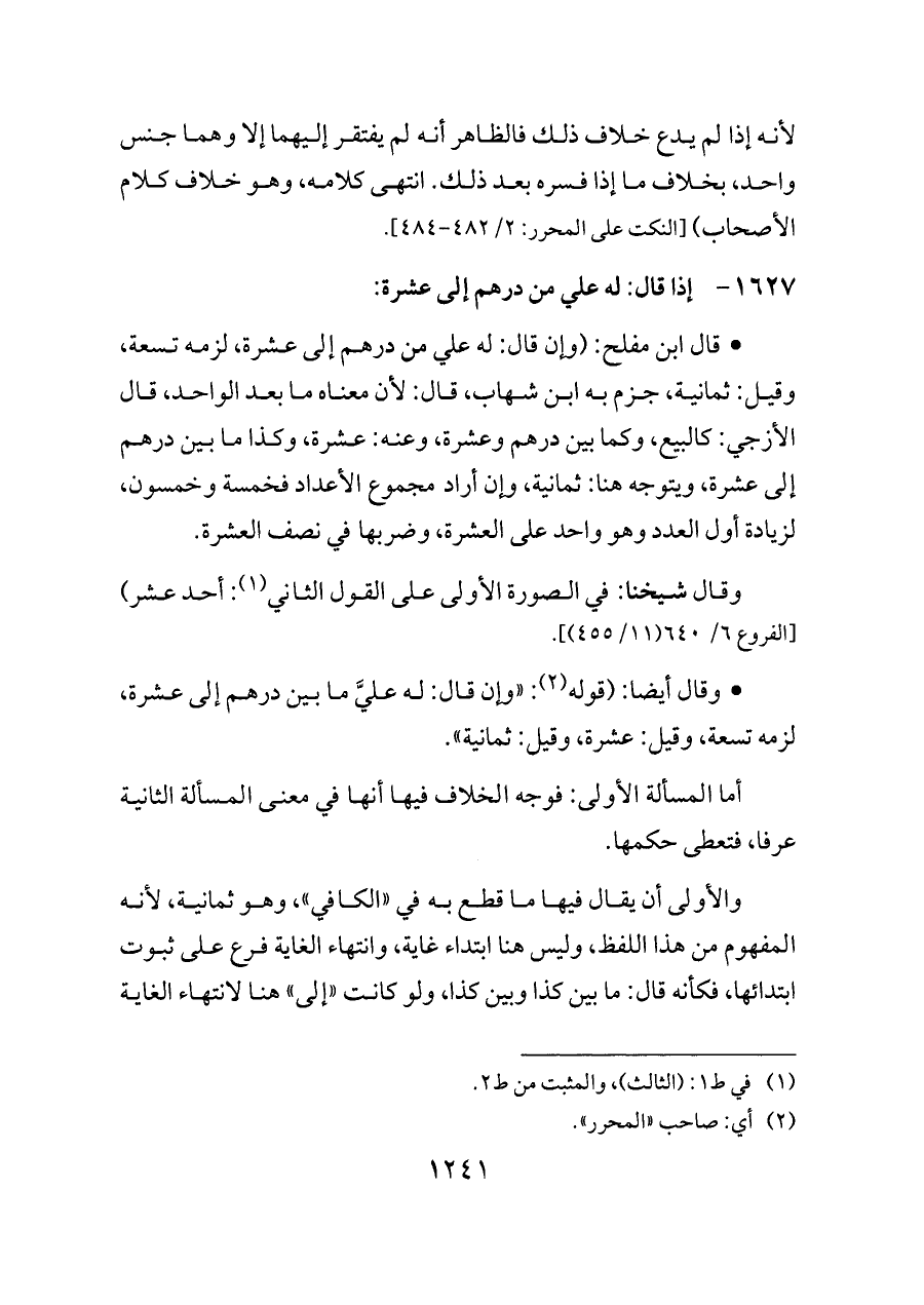 - قال ابن مفلح: (وإن قال: له علي من درهم إلى عشرة، لزمه تسعة، وقيل: ثمانية، جزم به ابن شهاب، قال: لأن معناه ما بعد الواحد، قال الأزجي: كالبيع، وكما بين درهم وعشرة، وعنه: عشرة، وكذا ما بين درهم إلى عشرة، ويتوجه هنا: ثمانية، وإن أراد مجموع الأعداد فخمسة وخمسون، لزيادة أول العدد وهو واحد على العشرة، وضربها في نصف العشرة.