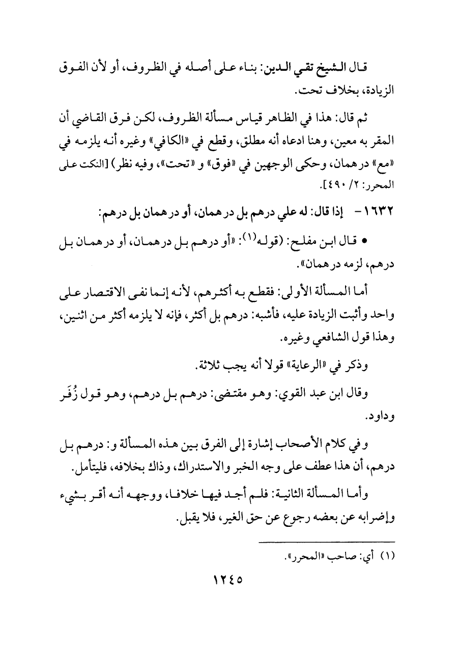 ثم قال: هذا في الظاهر قياس مسألة الظروف، لكن فرق القاضي أن المقر به معين، وهنا ادعاه أنه مطلق، وقطع في «الكافي» وغيره أنه يلزمه في «مع» درهمان، وحكى الوجهين في «فوق» و «تحت»، وفيه نظر) [النكت على المحرر: ٢/ ٤٩٠].