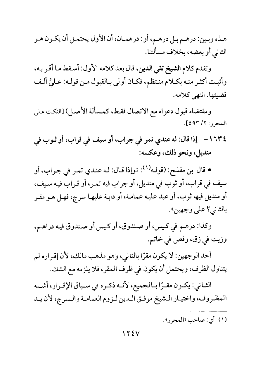 - قال ابن مفلح: (قوله (¬١): «وإذا قال: له عندي تمر في جراب، أو سيف في قراب، أو ثوب في منديل، أو جراب فيه تمر، أو قراب فيه سيف، أو منديل فيها ثوب، أو عبد عليه عمامة، أو دابة عليها سرج، فهل هو مقر بالثاني؟ على وجهين».