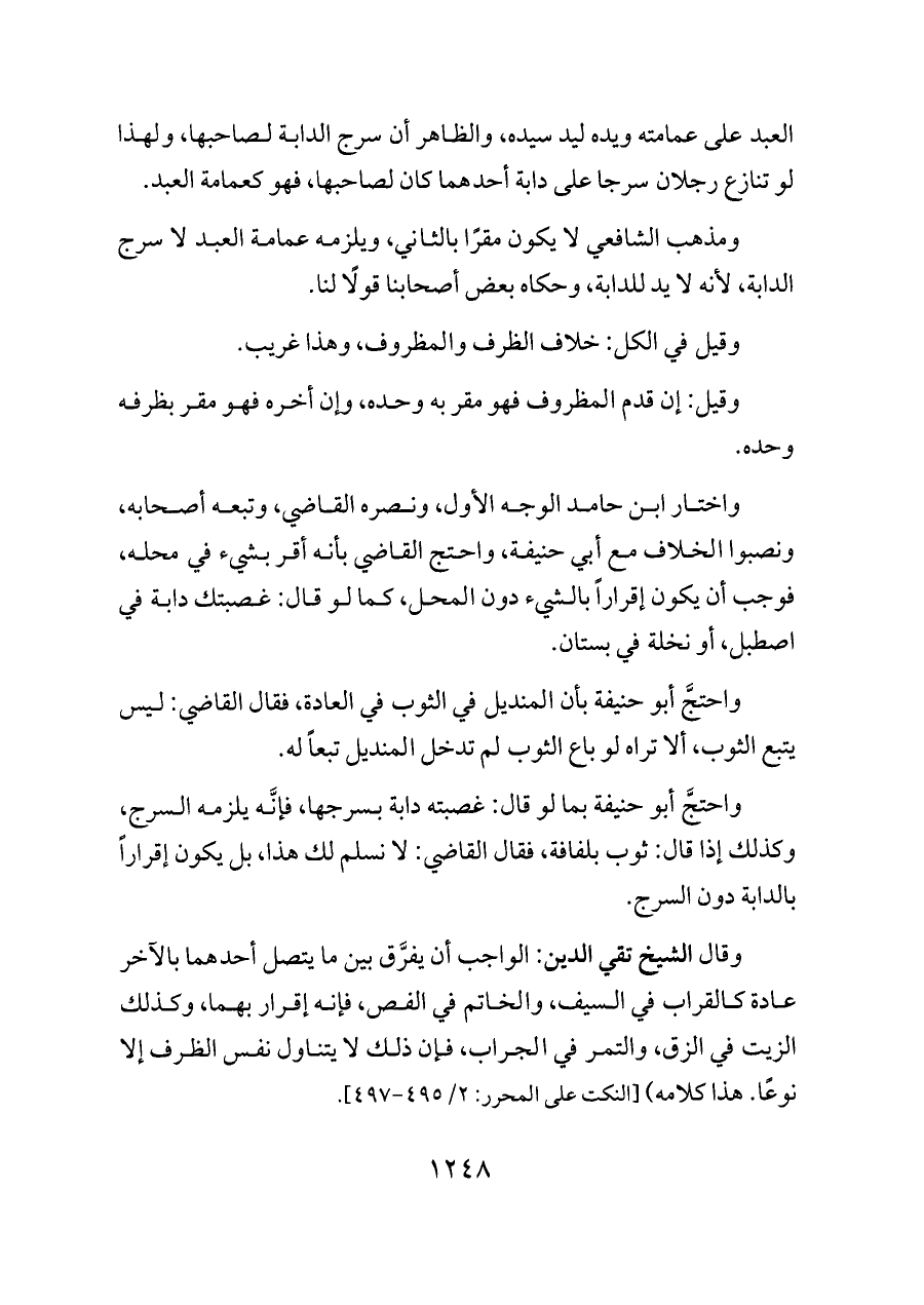 واختار ابن حامد الوجه الأول، ونصره القاضي، وتبعه أصحابه، ونصبوا الخلاف مع أبي حنيفة، واحتج القاضي بأنه أقر بشيء في محله، فوجب أن يكون إقراراً بالشيء دون المحل، كما لو قال: غصبتك دابة في اصطبل، أو نخلة في بستان.