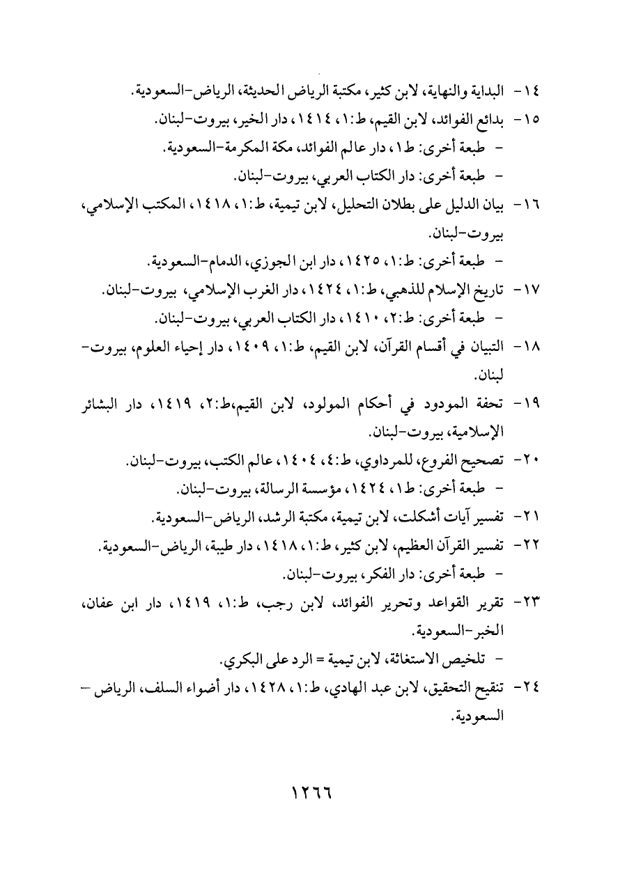 ١٥ - بدائع الفوائد, لابن القيم, ط: ١, ١٤١٤, دار الخير, بيروت-لبنان.