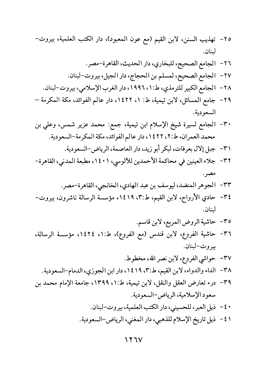 ٣٠ - الجامع لسيرة شيخ الإسلام ابن تيمية, جمع: محمد عزير شمس, وعلي بن محمد العمران, ط: ٢, ١٤٢٢, دار عالم الفوائد, مكة المكرمة-السعودية.