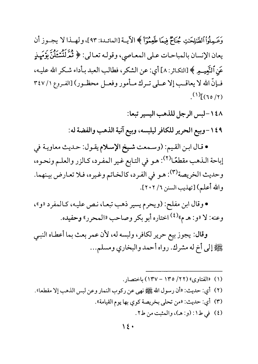 - وقال ابن مفلح: (ويحرم يسير ذهب تبعا، نص عليه، كالمفرد «و»، وعنه: لا «و: هـ م» (¬٤) اختاره أبو بكر وصاحب «المحرر» وحفيده.