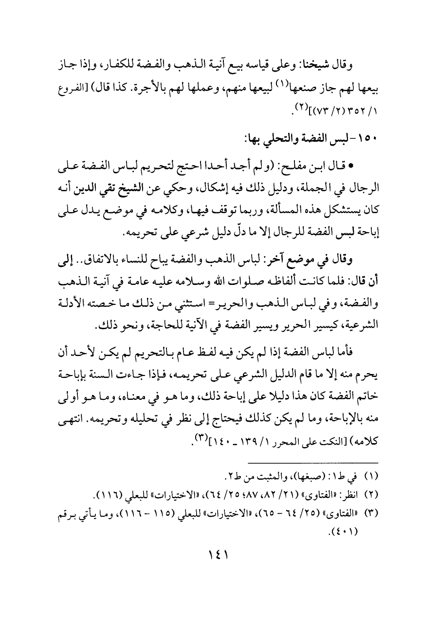 - قال ابن مفلح: (ولم أجد أحدا احتج لتحريم لباس الفضة على الرجال في الجملة، ودليل ذلك فيه إشكال، وحكي عن الشيخ تقي الدين أنه كان يستشكل هذه المسألة، وربما توقف فيها، وكلامه في موضع يدل على إباحة لبس الفضة للرجال إلا ما دلّ دليل شرعي على تحريمه.