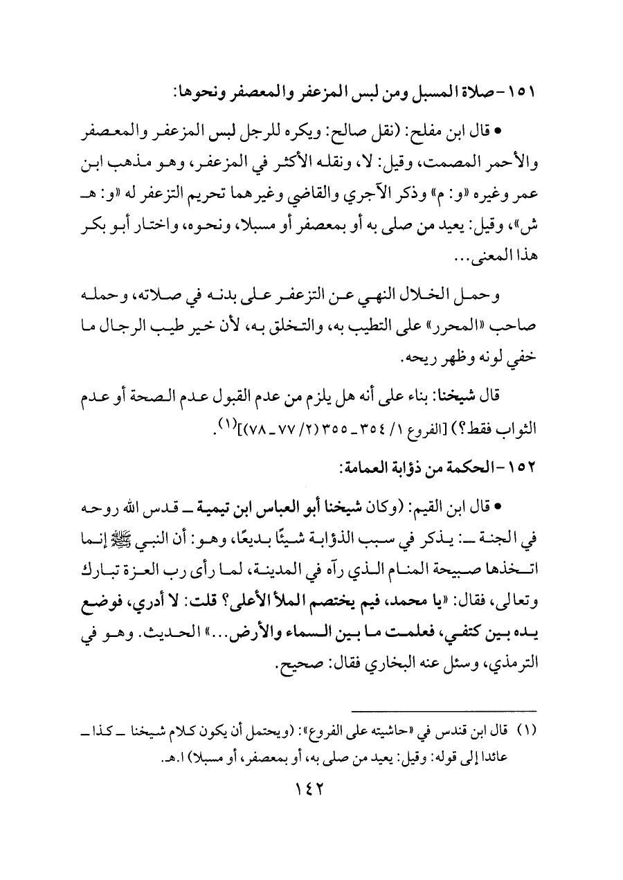 (¬١) قال ابن قندس في «حاشيته على الفروع»: (ويحتمل أن يكون كلام شيخنا ــ كذا ــ عائدا إلى قوله: وقيل: يعيد من صلى به، أو بمعصفر، أو مسبلا) ا. هـ.