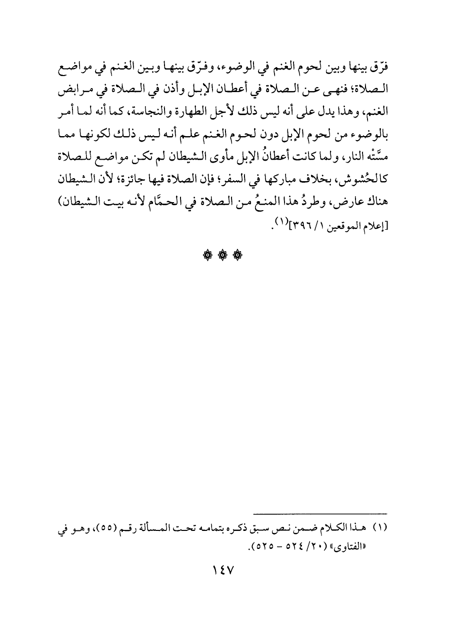 فرّق بينها وبين لحوم الغنم في الوضوء، وفرّق بينها وبين الغنم في مواضع الصلاة؛ فنهى عن الصلاة في أعطان الإبل وأذن في الصلاة في مرابض الغنم، وهذا يدل على أنه ليس ذلك لأجل الطهارة والنجاسة، كما أنه لما أمر بالوضوء من لحوم الإبل دون لحوم الغنم علم أنه ليس ذلك لكونها مما مسَّتْه النار، ولما كانت أعطانُ الإبل مأوى الشيطان لم تكن مواضع للصلاة كالحُشوش، بخلاف مباركها في السفر؛ فإن الصلاة فيها جائزة؛ لأن الشيطان هناك عارض، وطردُ هذا المنعُ من الصلاة في الحمَّام لأنه بيت الشيطان) [إعلام الموقعين ١/ ٣٩٦] (¬١).