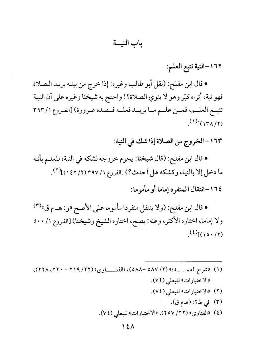 - قال ابن مفلح: (نقل أبو طالب وغيره: إذا خرج من بيته يريد الصلاة فهو نية، أتراه كبّر وهو لا ينوي الصلاة؟! واحتج به شيخنا وغيره على أن النية تتبع العلم، فمن علم ما يريد فعله قصده ضرورة) [الفروع ١/ ٣٩٣ (٢/ ١٣٨)] (¬١).