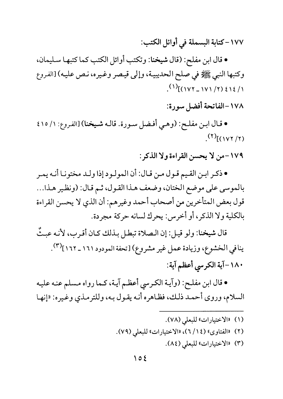- قال ابن مفلح: (قال شيخنا: وتكتب أوائل الكتب كما كتبها سليمان، وكتبها النبي - صلى الله عليه وسلم - في صلح الحديبية، وإلى قيصر وغيره، نص عليه) [الفروع ١/ ٤١٤ (٢/ ١٧١ ــ ١٧٢)] (¬١).