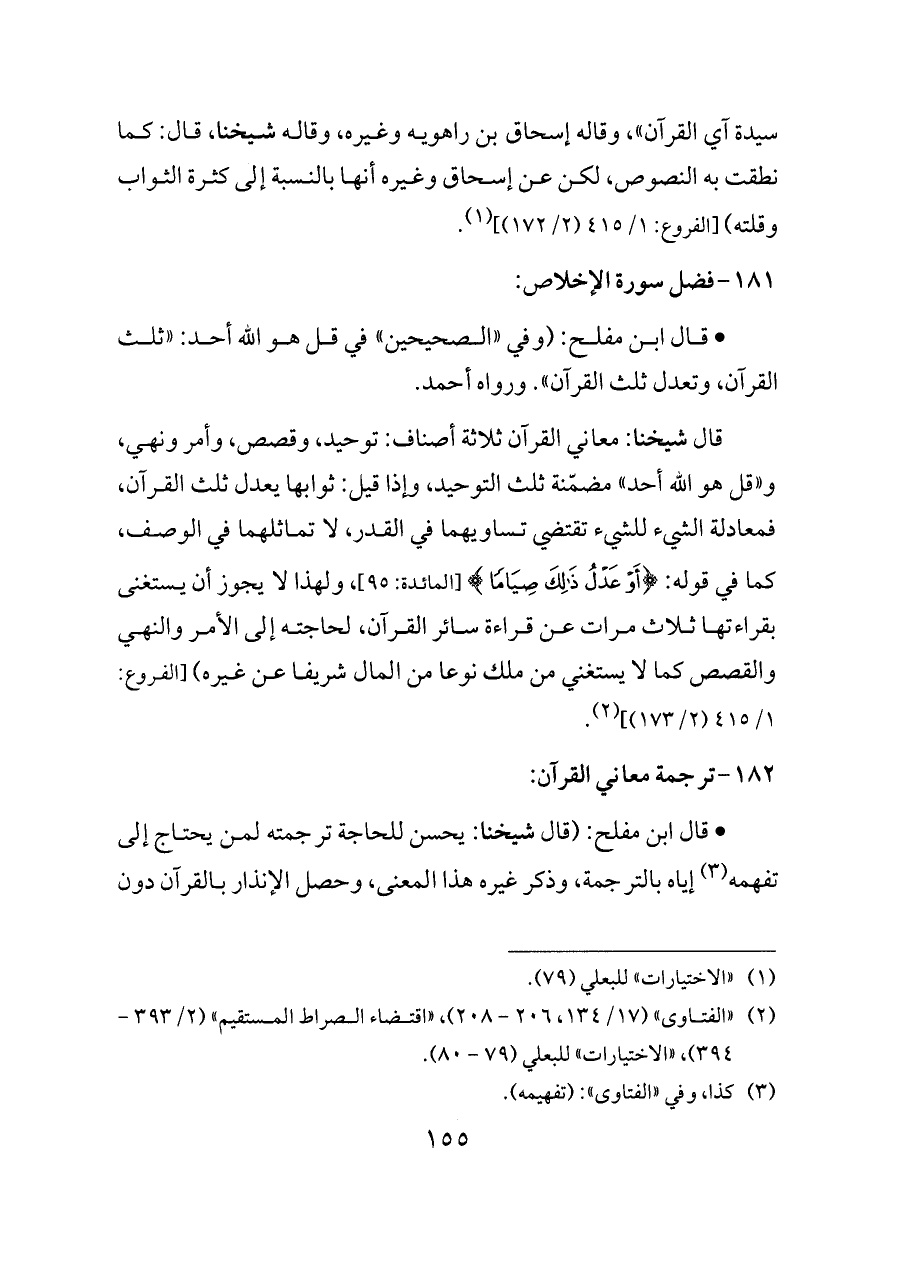 قال شيخنا: معاني القرآن ثلاثة أصناف: توحيد، وقصص، وأمر ونهي، و «قل هو الله أحد» مضمّنة ثلث التوحيد، وإذا قيل: ثوابها يعدل ثلث القرآن، فمعادلة الشيء للشيء تقتضي تساويهما في القدر، لا تماثلهما في الوصف، كما في قوله: {أَوْ عَدْلُ ذَلِكَ صِيَامًا} [المائدة: ٩٥]، ولهذا لا يجوز أن يستغنى بقراءتها ثلاث مرات عن قراءة سائر القرآن، لحاجته إلى الأمر والنهي والقصص كما لا يستغني من ملك نوعا من المال شريفا عن غيره) [الفروع: ١/ ٤١٥ (٢/ ١٧٣)] (¬٢).