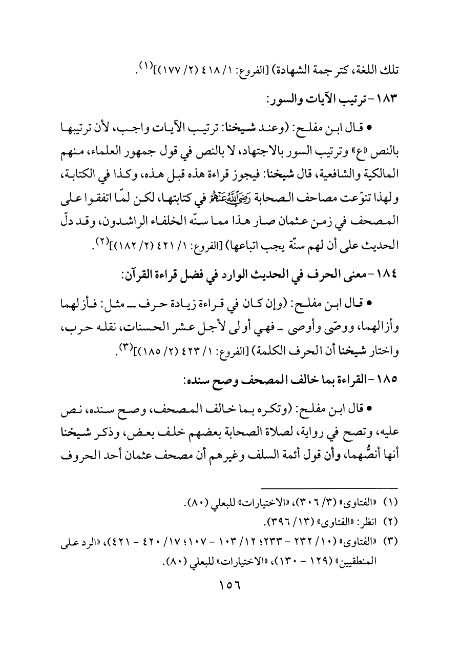 - قال ابن مفلح: (وعند شيخنا: ترتيب الآيات واجب، لأن ترتيبها بالنص «ع» وترتيب السور بالاجتهاد، لا بالنص في قول جمهور العلماء، منهم المالكية والشافعية، قال شيخنا: فيجوز قراءة هذه قبل هذه، وكذا في الكتابة، ولهذا تنوّعت مصاحف الصحابة - رضي الله عنهم - في كتابتها، لكن لمّا اتفقوا على المصحف في زمن عثمان صار هذا مما سنّه الخلفاء الراشدون، وقد دلّ الحديث على أن لهم سنّة يجب اتباعها) [الفروع: ١/ ٤٢١ (٢/ ١٨٢)] (¬٢).