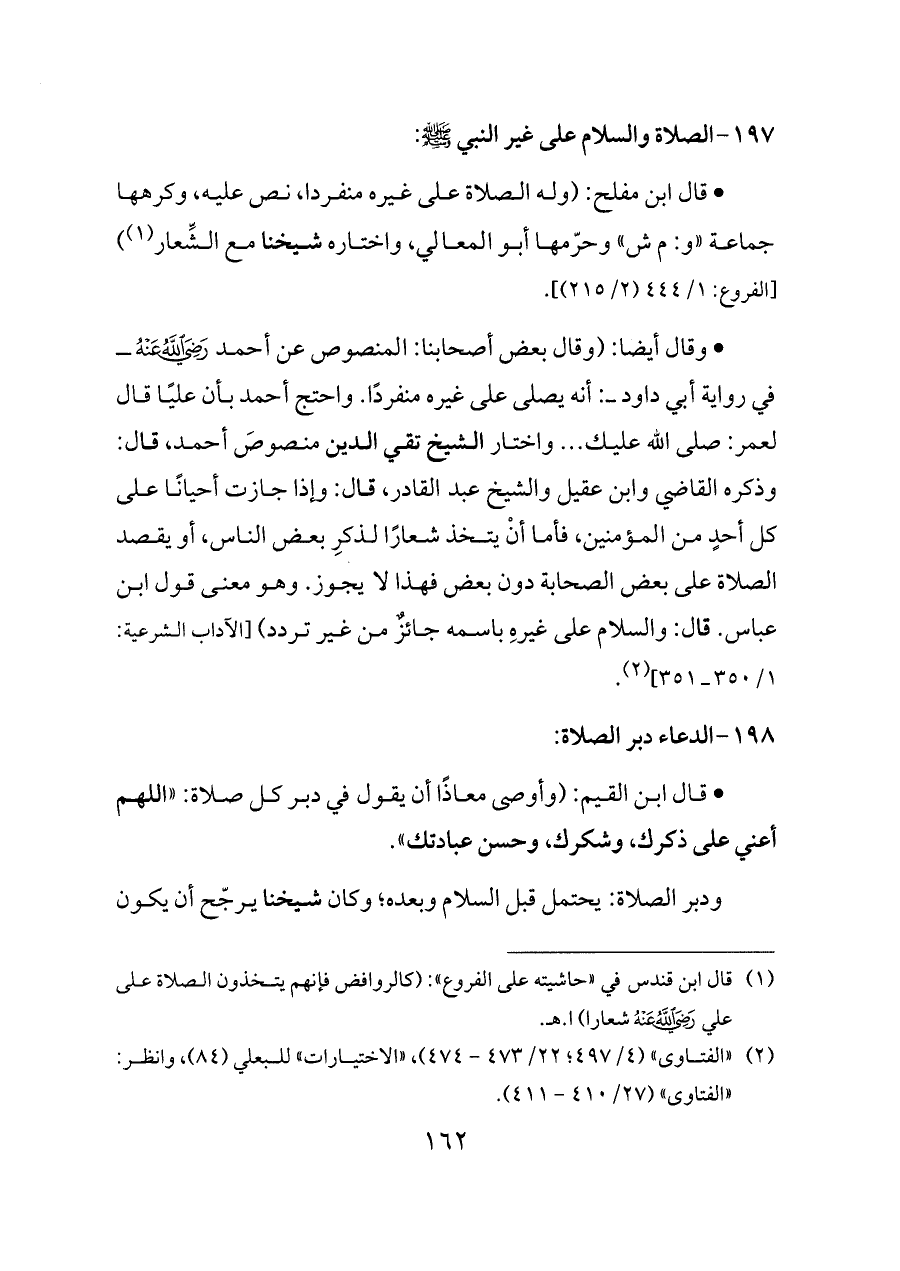 (¬١) قال ابن قندس في «حاشيته على الفروع»: (كالروافض فإنهم يتخذون الصلاة على علي - رضي الله عنه - شعارا) ا. هـ.