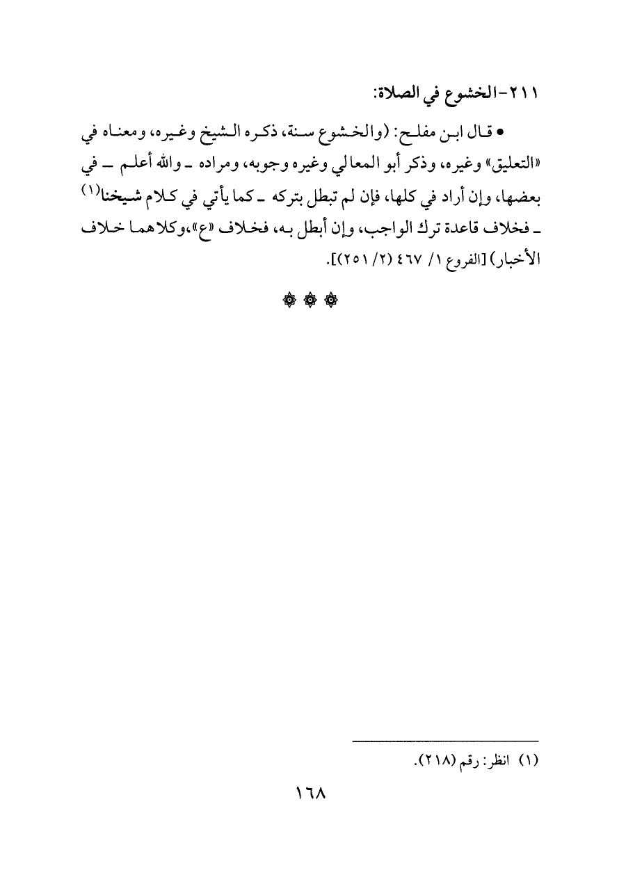 - قال ابن مفلح: (والخشوع سنة، ذكره الشيخ وغيره، ومعناه في «التعليق» وغيره، وذكر أبو المعالي وغيره وجوبه، ومراده ــ والله أعلم ــ في بعضها، وإن أراد في كلها، فإن لم تبطل بتركه ــ كما يأتي في كلام شيخنا (¬١) ــ فخلاف قاعدة ترك الواجب، وإن أبطل به، فخلاف «ع»، وكلاهما خلاف الأخبار) [الفروع ١/ ٤٦٧ (٢/ ٢٥١)].