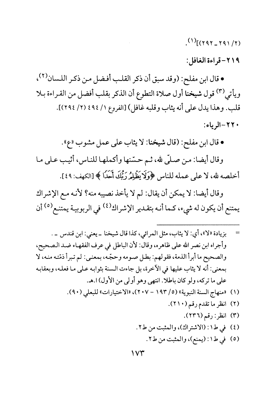 - قال ابن مفلح: (قال شيخنا: لا يثاب على عمل مشوب «ع».