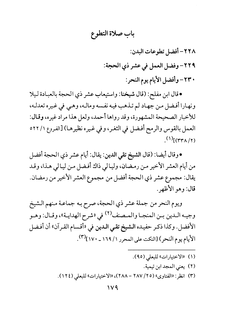 - وقال أيضا: (قال الشيخ تقي الدين: يقال: أيام عشر ذي الحجة أفضل من أيام العشر الأخير من رمضان، وليالي ذاك أفضل من ليالي هذا، وقد يقال: مجموع عشر ذي الحجة أفضل من مجموع العشر الأخير من رمضان. قال: وهو الأظهر.