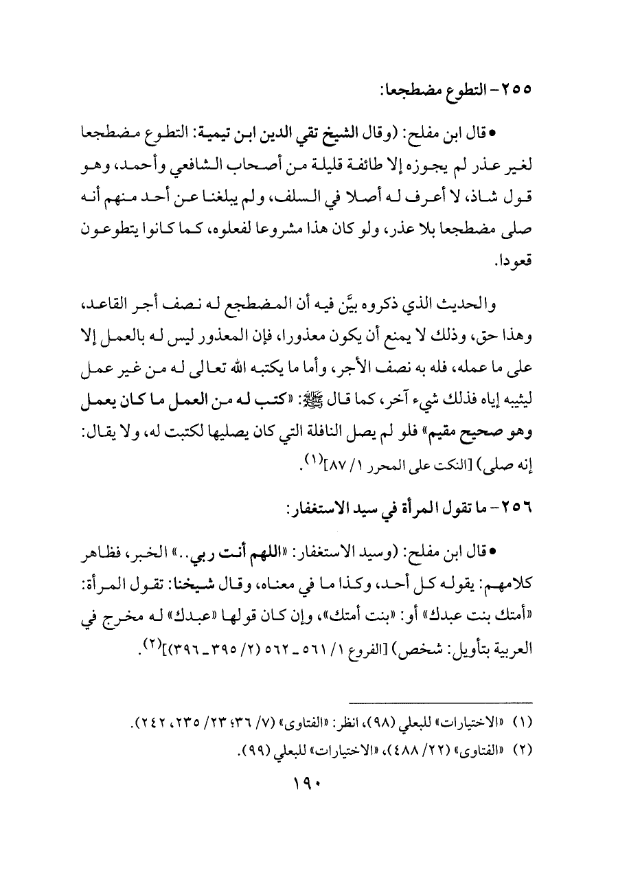 - قال ابن مفلح: (وقال الشيخ تقي الدين ابن تيمية: التطوع مضطجعا لغير عذر لم يجوزه إلا طائفة قليلة من أصحاب الشافعي وأحمد، وهو قول شاذ، لا أعرف له أصلا في السلف، ولم يبلغنا عن أحد منهم أنه صلى مضطجعا بلا عذر، ولو كان هذا مشروعا لفعلوه، كما كانوا يتطوعون قعودا.