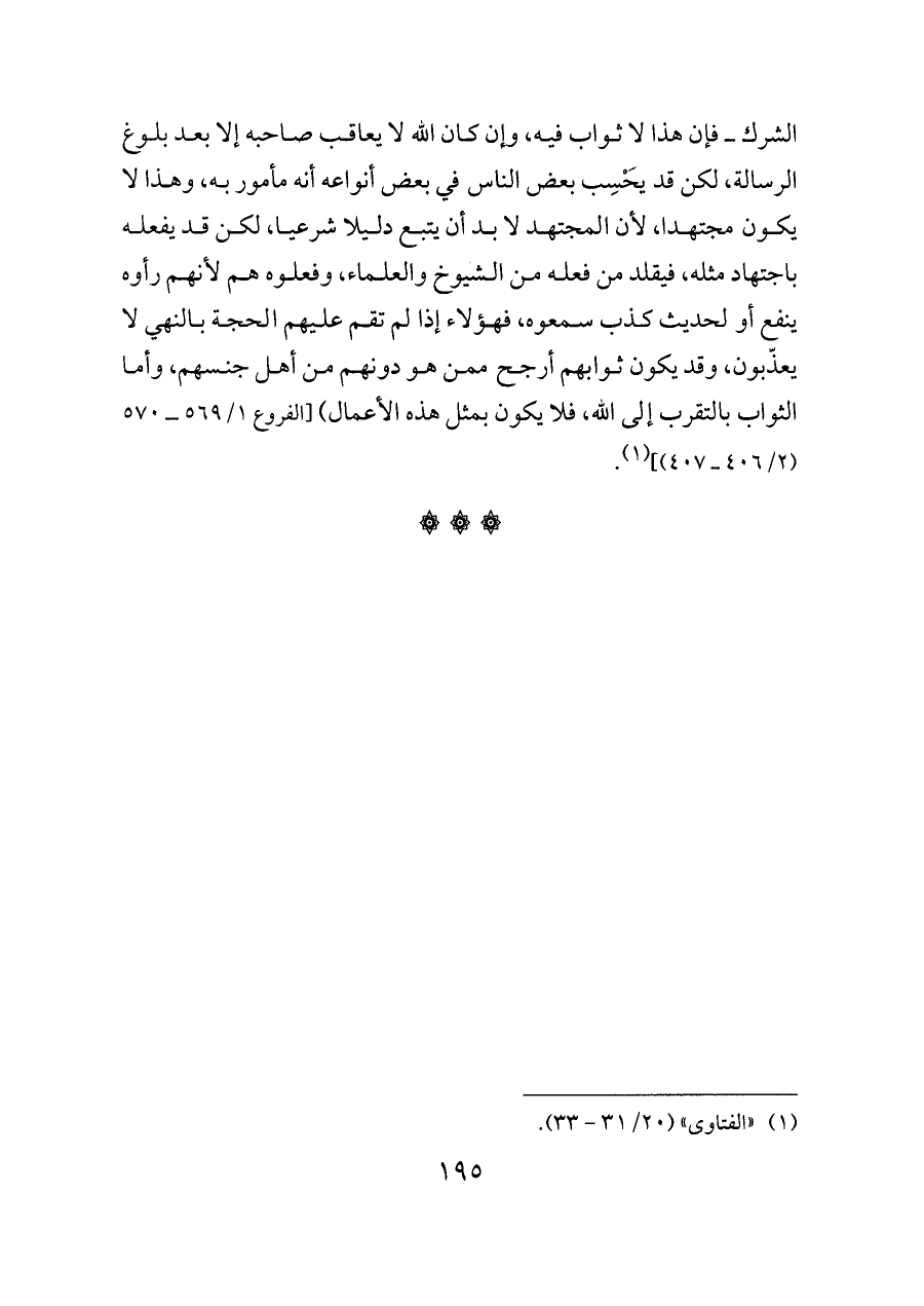 الشرك ــ فإن هذا لا ثواب فيه، وإن كان الله لا يعاقب صاحبه إلا بعد بلوغ الرسالة، لكن قد يَحْسِب بعض الناس في بعض أنواعه أنه مأمور به، وهذا لا يكون مجتهدا، لأن المجتهد لا بد أن يتبع دليلا شرعيا، لكن قد يفعله باجتهاد مثله، فيقلد من فعله من الشيوخ والعلماء، وفعلوه هم لأنهم رأوه ينفع أو لحديث كذب سمعوه، فهؤلاء إذا لم تقم عليهم الحجة بالنهي لا يعذّبون، وقد يكون ثوابهم أرجح ممن هو دونهم من أهل جنسهم، وأما الثواب بالتقرب إلى الله، فلا يكون بمثل هذه الأعمال) [الفروع ١/ ٥٦٩ ــ ٥٧٠ (٢/ ٤٠٦ ــ ٤٠٧)] (¬١).