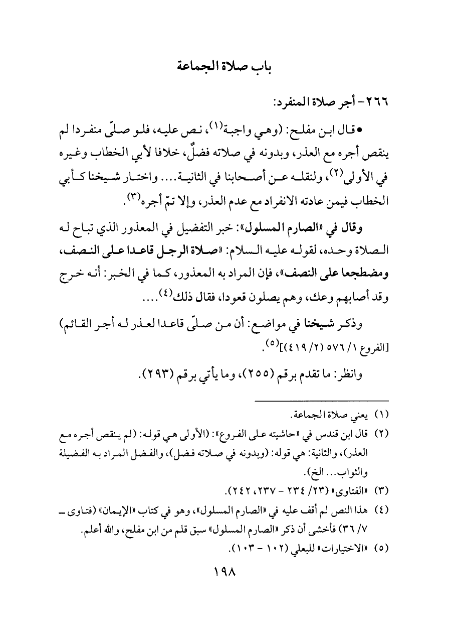 (¬٢) قال ابن قندس في «حاشيته على الفروع»: (الأولى هي قوله: (لم ينقص أجره مع العذر)، والثانية: هي قوله: (وبدونه في صلاته فضل)، والفضل المراد به الفضيلة والثواب ... الخ).