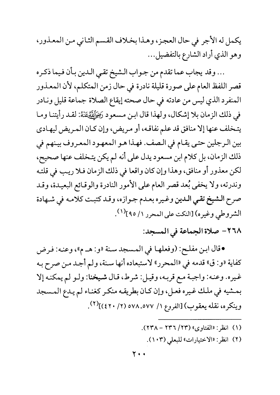 وقد يجاب عما تقدم من جواب الشيخ تقي الدين بأن فيما ذكره قصر اللفظ العام على صورة قليلة نادرة في حال زمن المتكلم، لأن المعذور المنفرد الذي ليس من عادته في حال صحته إيقاع الصلاة جماعة قليل ونادر في ذلك الزمان بلا إشكال، ولهذا قال ابن مسعود - رضي الله عنه -: لقد رأيتنا وما يتخلف عنها إلا منافق قد علم نفاقه، أو مريض، وإن كان المريض ليهادى بين الرجلين حتى يقام في الصف. فهذا هو المعهود المعروف بينهم في ذلك الزمان، بل كلام ابن مسعود يدل على أنه لم يكن يتخلف عنها صحيح، لكن معذور أو منافق، وهذا وإن كان واقعا في ذلك الزمان فلا ريب في قلته وندرته، ولا يخفى بُعد قصر العام على الأمور النادرة والوقائع البعيدة، وقد صرح الشيخ تقي الدين وغيره بعدم جوازه، وقد كتبت كلامه في شهادة الشروطي وغيره) [النكت على المحرر ١/ ٩٥] (¬١).