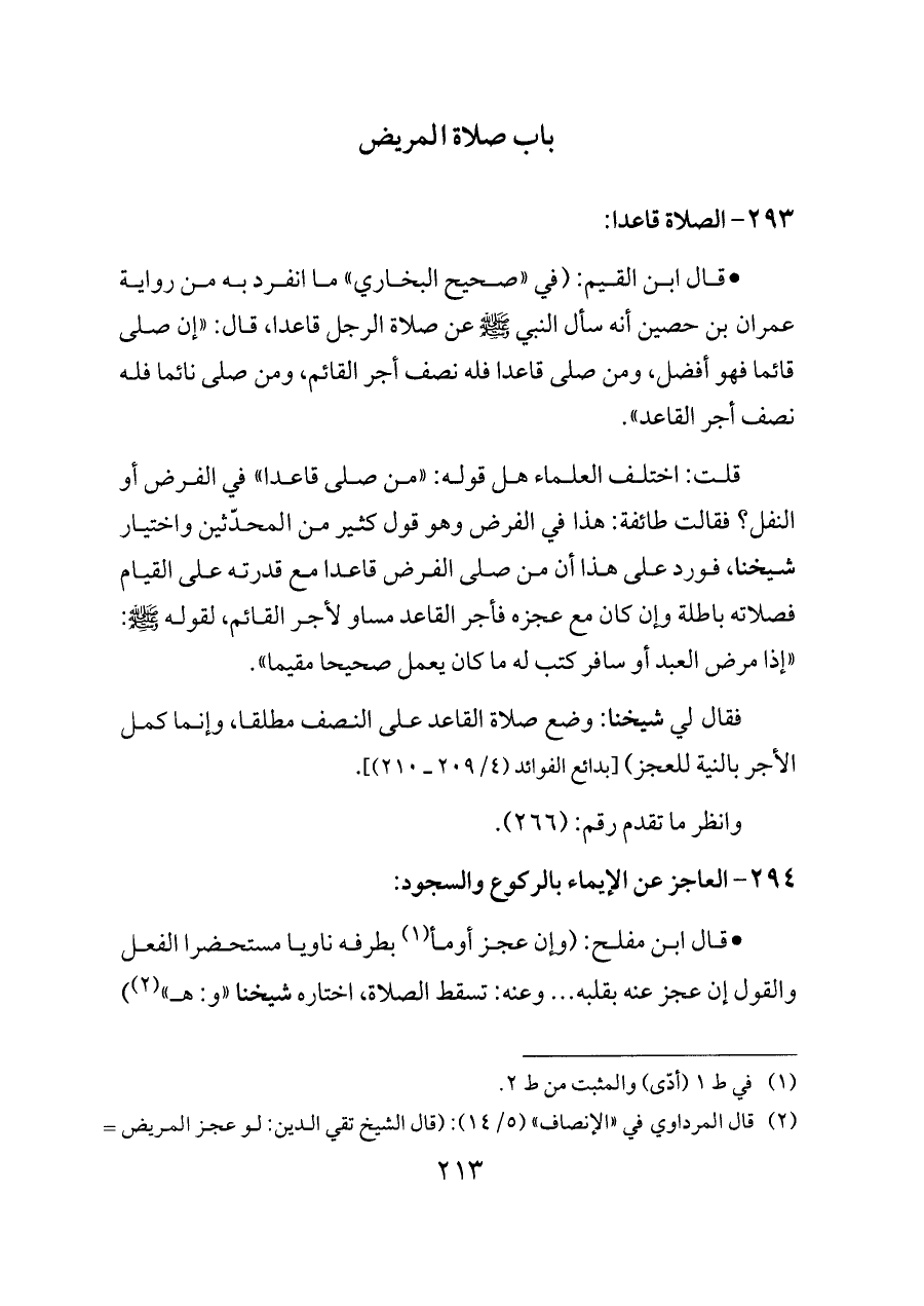 - قال ابن القيم: (في «صحيح البخاري» ما انفرد به من رواية عمران بن حصين أنه سأل النبي - صلى الله عليه وسلم - عن صلاة الرجل قاعدا، قال: «إن صلى قائما فهو أفضل، ومن صلى قاعدا فله نصف أجر القائم، ومن صلى نائما فله نصف أجر القاعد».
