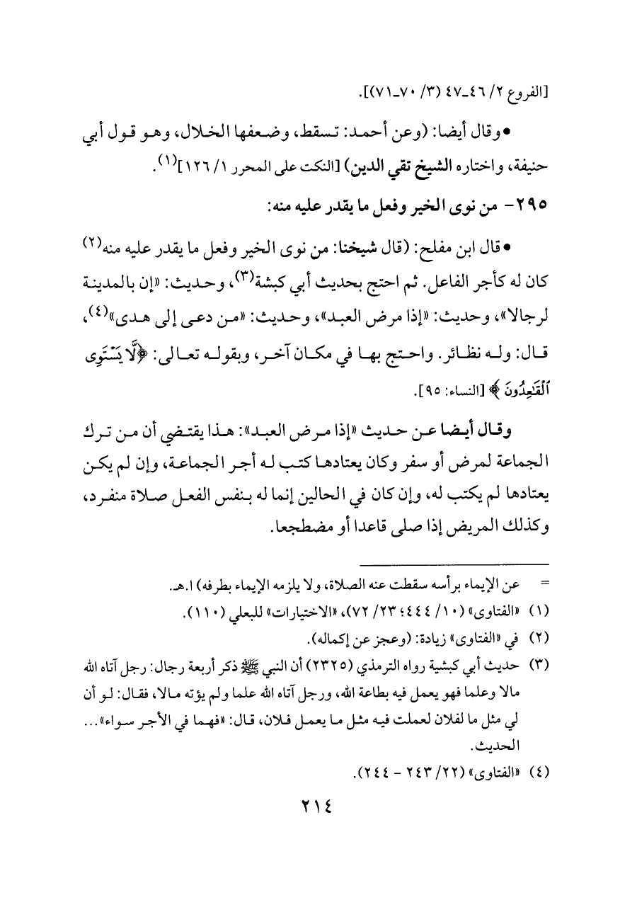 - قال ابن مفلح: (قال شيخنا: من نوى الخير وفعل ما يقدر عليه منه (¬٢) كان له كأجر الفاعل. ثم احتج بحديث أبي كبشة (¬٣)، وحديث: «إن بالمدينة لرجالا»، وحديث: «إذا مرض العبد»، وحديث: «من دعى إلى هدى» (¬٤)، قال: وله نظائر. واحتج بها في مكان آخر، وبقوله تعالى: {لَا يَسْتَوِي الْقَاعِدُونَ} [النساء: ٩٥].