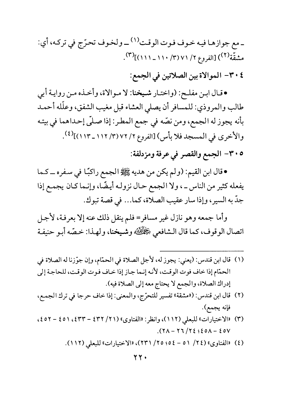 - قال ابن مفلح: (واختار شيخنا: لا موالاة، وأخذه من رواية أبي طالب والمروذي: للمسافر أن يصلي العشاء قبل مغيب الشفق، وعلّله أحمد بأنه يجوز له الجمع، ومن نصّه في جمع المطر: إذا صلّى إحداهما في بيته والأخرى في المسجد فلا بأس) [الفروع ٢/ ٧٢ (٣/ ١١٢ ــ ١١٣)] (¬٤).