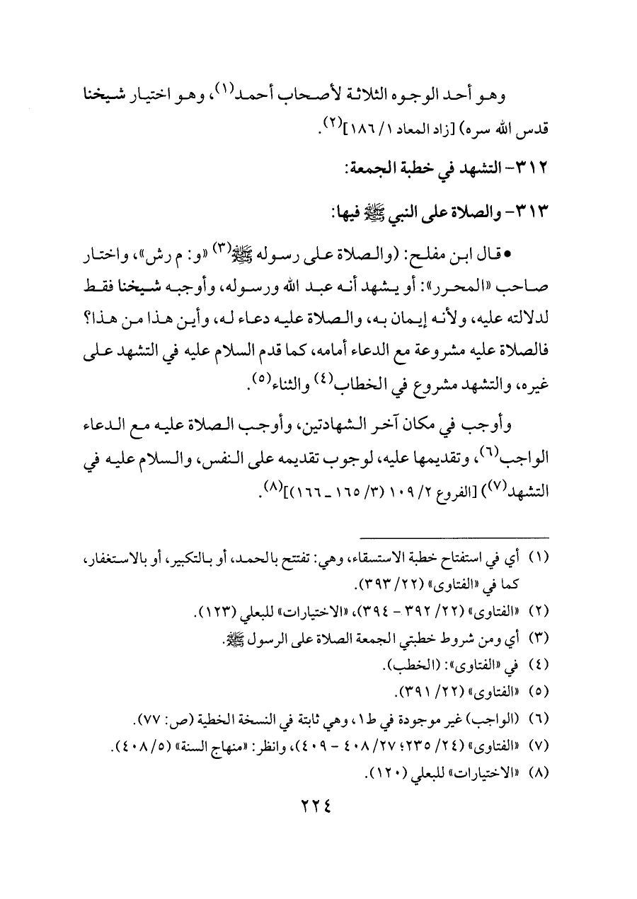 - قال ابن مفلح: (والصلاة على رسوله - صلى الله عليه وسلم - (¬٣) «و: م رش»، واختار صاحب «المحرر»: أو يشهد أنه عبد الله ورسوله، وأوجبه شيخنا فقط لدلالته عليه، ولأنه إيمان به، والصلاة عليه دعاء له، وأين هذا من هذا؟ فالصلاة عليه مشروعة مع الدعاء أمامه، كما قدم السلام عليه في التشهد على غيره، والتشهد مشروع في الخطاب (¬٤) والثناء (¬٥).