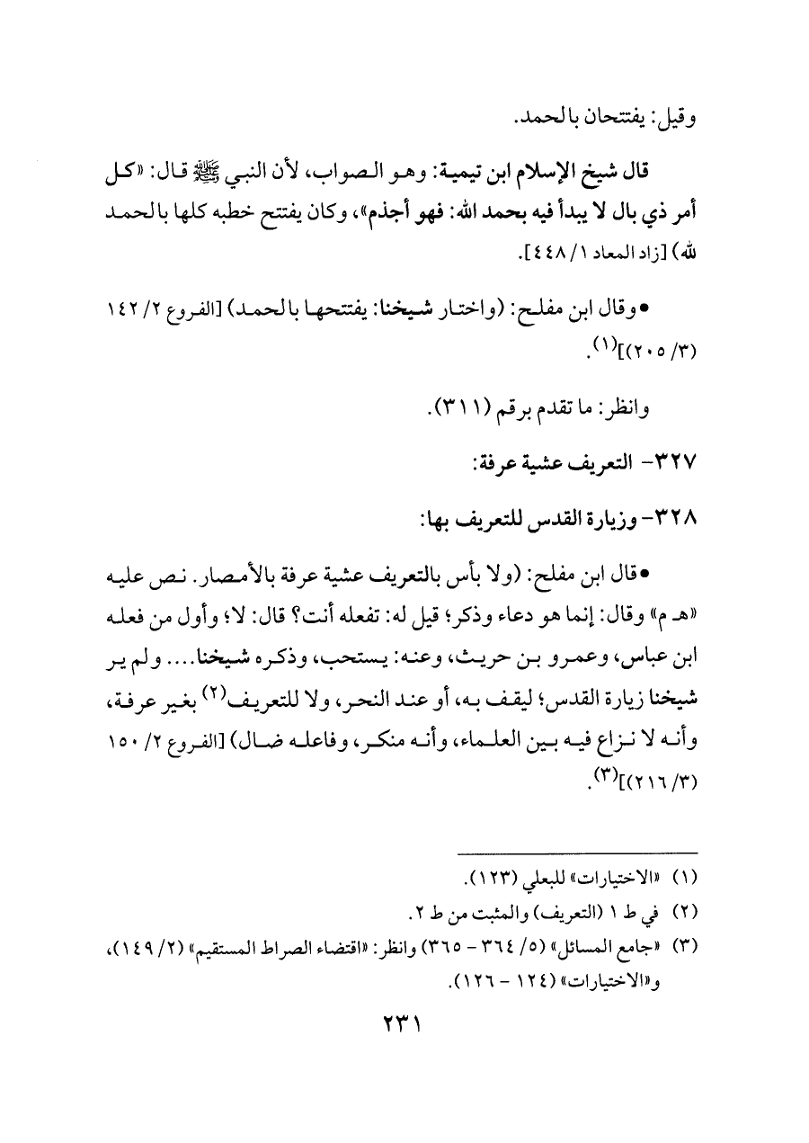 - قال ابن مفلح: (ولا بأس بالتعريف عشية عرفة بالأمصار. نص عليه «هـ م» وقال: إنما هو دعاء وذكر؛ قيل له: تفعله أنت؟ قال: لا؛ وأول من فعله ابن عباس، وعمرو بن حريث، وعنه: يستحب، وذكره شيخنا .... ولم ير شيخنا زيارة القدس؛ ليقف به، أو عند النحر، ولا للتعريف (¬٢) بغير عرفة، وأنه لا نزاع فيه بين العلماء، وأنه منكر، وفاعله ضال) [الفروع ٢/ ١٥٠ (٣/ ٢١٦)] (¬٣).