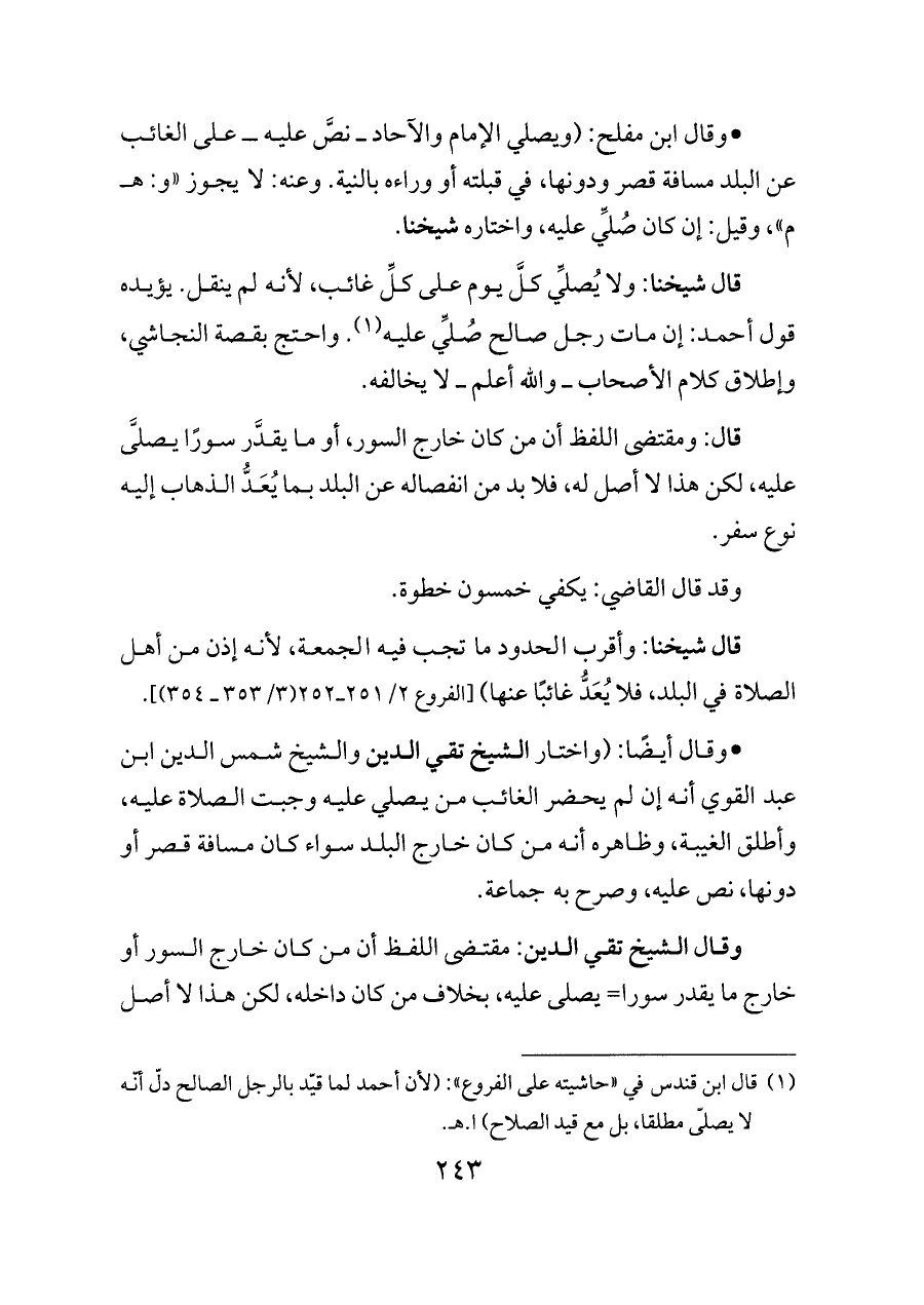- وقال أيضًا: (واختار الشيخ تقي الدين والشيخ شمس الدين ابن عبد القوي أنه إن لم يحضر الغائب من يصلي عليه وجبت الصلاة عليه، وأطلق الغيبة، وظاهره أنه من كان خارج البلد سواء كان مسافة قصر أو دونها، نص عليه، وصرح به جماعة.