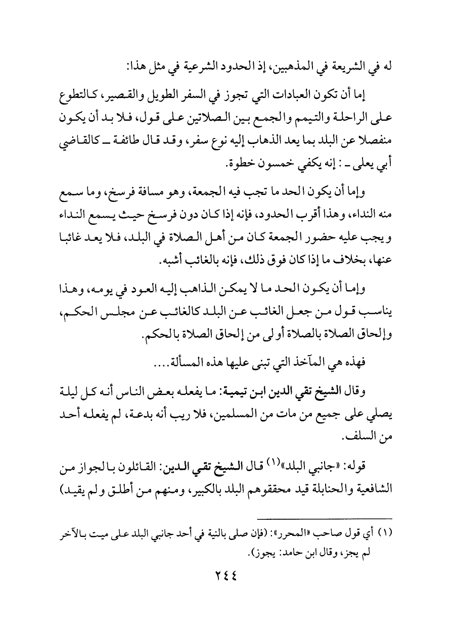 وإما أن يكون الحد ما تجب فيه الجمعة، وهو مسافة فرسخ، وما سمع منه النداء، وهذا أقرب الحدود، فإنه إذا كان دون فرسخ حيث يسمع النداء ويجب عليه حضور الجمعة كان من أهل الصلاة في البلد، فلا يعد غائبا عنها، بخلاف ما إذا كان فوق ذلك، فإنه بالغائب أشبه.