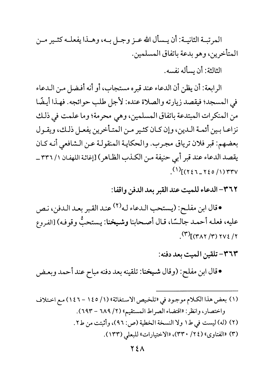 - قال ابن مفلح: (وقال شيخنا: تلقينه بعد دفنه مباح عند أحمد وبعض