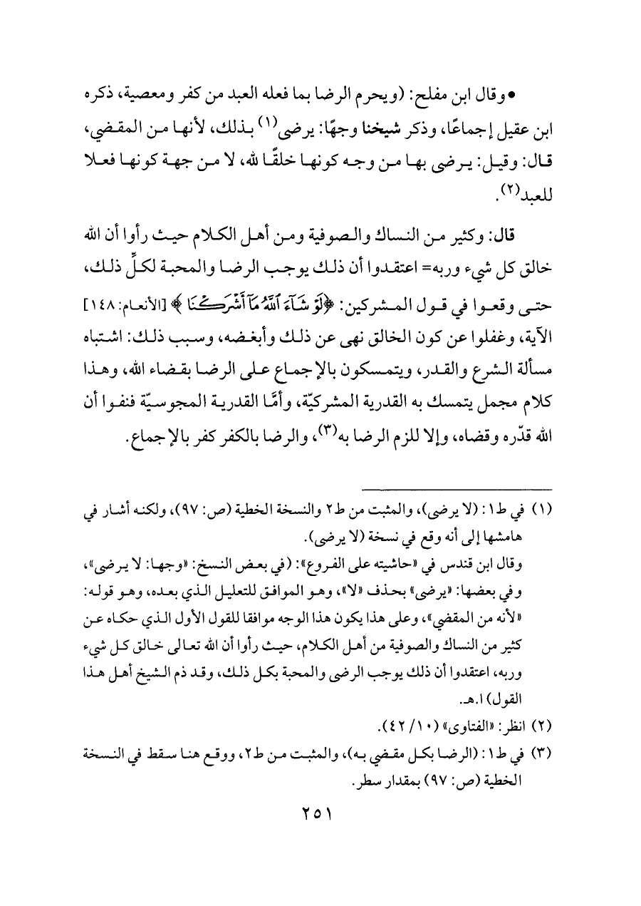 وقال ابن قندس في «حاشيته على الفروع»: (في بعض النسخ: «وجها: لا يرضى»، وفي بعضها: «يرضى» بحذف «لا»، وهو الموافق للتعليل الذي بعده، وهو قوله: «لأنه من المقضي»، وعلى هذا يكون هذا الوجه موافقا للقول الأول الذي حكاه عن كثير من النساك والصوفية من أهل الكلام، حيث رأوا أن الله تعالى خالق كل شيء وربه، اعتقدوا أن ذلك يوجب الرضى والمحبة بكل ذلك، وقد ذم الشيخ أهل هذا القول) ا. هـ.