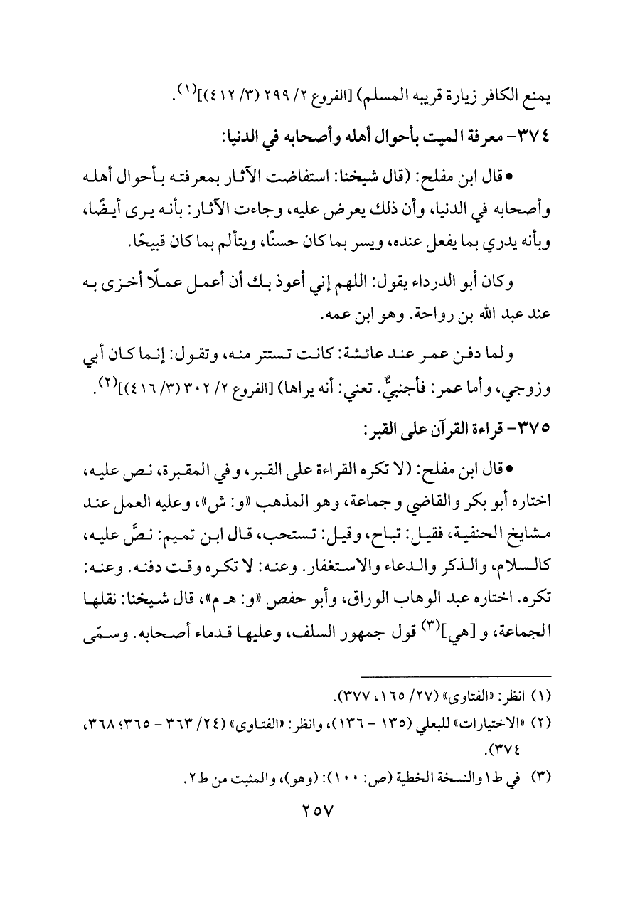 - قال ابن مفلح: (لا تكره القراءة على القبر، وفي المقبرة، نص عليه، اختاره أبو بكر والقاضي وجماعة، وهو المذهب «و: ش»، وعليه العمل عند مشايخ الحنفية، فقيل: تباح، وقيل: تستحب، قال ابن تميم: نصَّ عليه، كالسلام، والذكر والدعاء والاستغفار. وعنه: لا تكره وقت دفنه. وعنه: تكره. اختاره عبد الوهاب الوراق، وأبو حفص «و: هـ م»، قال شيخنا: نقلها الجماعة، و [هي] (¬٣) قول جمهور السلف، وعليها قدماء أصحابه. وسمّى