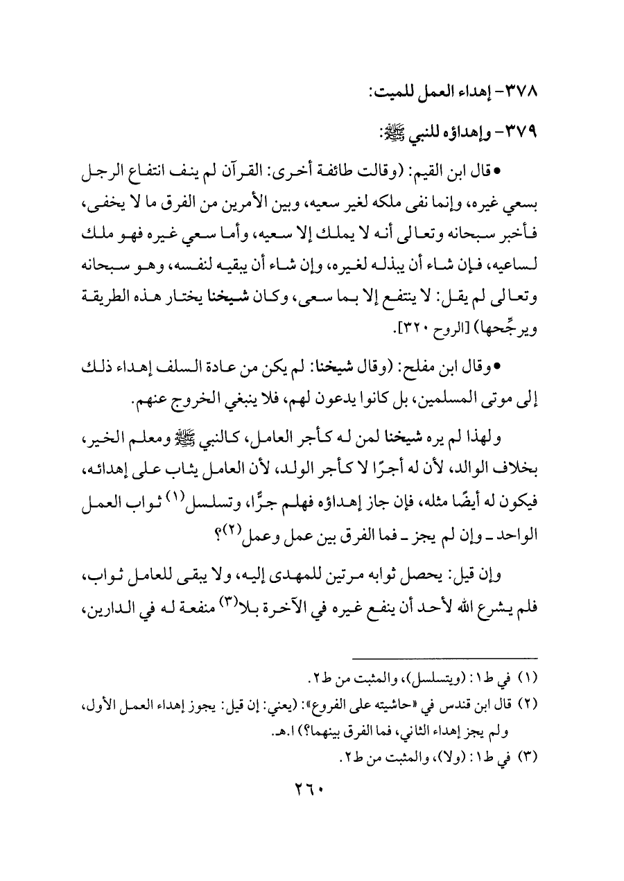 (¬٢) قال ابن قندس في «حاشيته على الفروع»: (يعني: إن قيل: يجوز إهداء العمل الأول، ولم يجز إهداء الثاني، فما الفرق بينهما؟) ا. هـ.