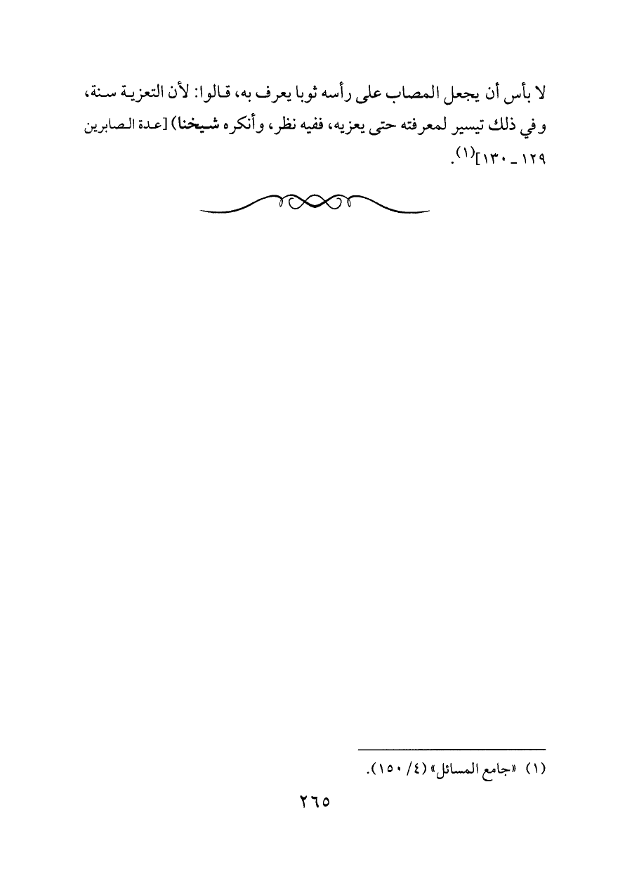 لا بأس أن يجعل المصاب على رأسه ثوبا يعرف به، قالوا: لأن التعزية سنة، وفي ذلك تيسير لمعرفته حتى يعزيه، ففيه نظر، وأنكره شيخنا) [عدة الصابرين ١٢٩ ــ ١٣٠] (¬١).