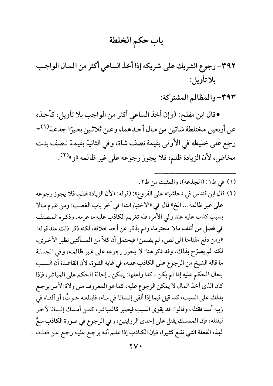 - قال ابن مفلح: (وإن أخذ الساعي أكثر من الواجب بلا تأويل، كأخذه عن أربعين مختلطة شاتين من مال أحدهما، وعن ثلاثين بعيرًا جذعة (¬١) = رجع على خليطه في الأولى بقيمة نصف شاة، وفي الثانية بقيمة نصف بنت مخاض، لأن الزيادة ظلم، فلا يجوز رجوعه على غير ظالمه «و» (¬٢).