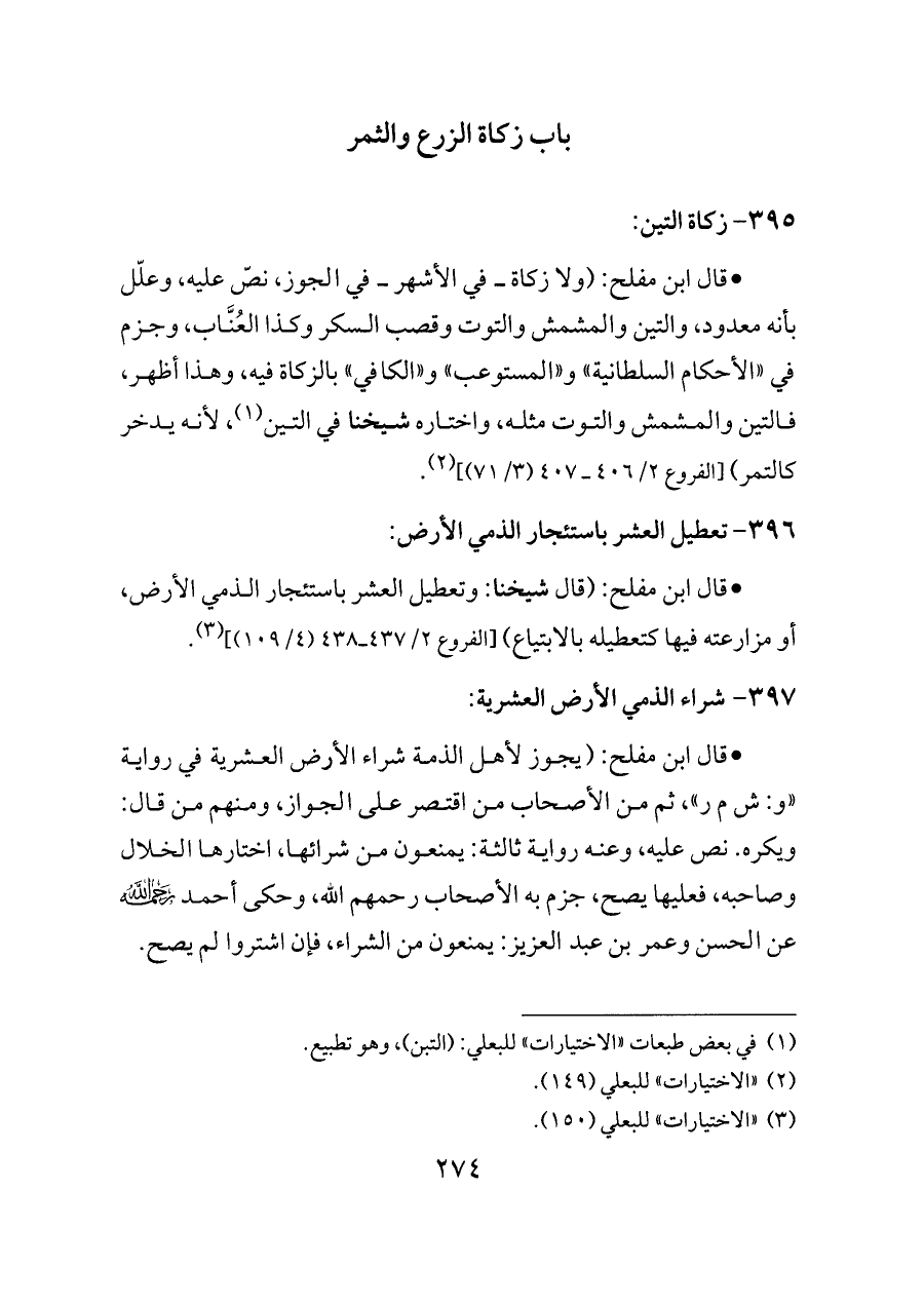 - قال ابن مفلح: (قال شيخنا: وتعطيل العشر باستئجار الذمي الأرض، أو مزارعته فيها كتعطيله بالابتياع) [الفروع ٢/ ٤٣٧ ــ ٤٣٨ (٤/ ١٠٩)] (¬٣).