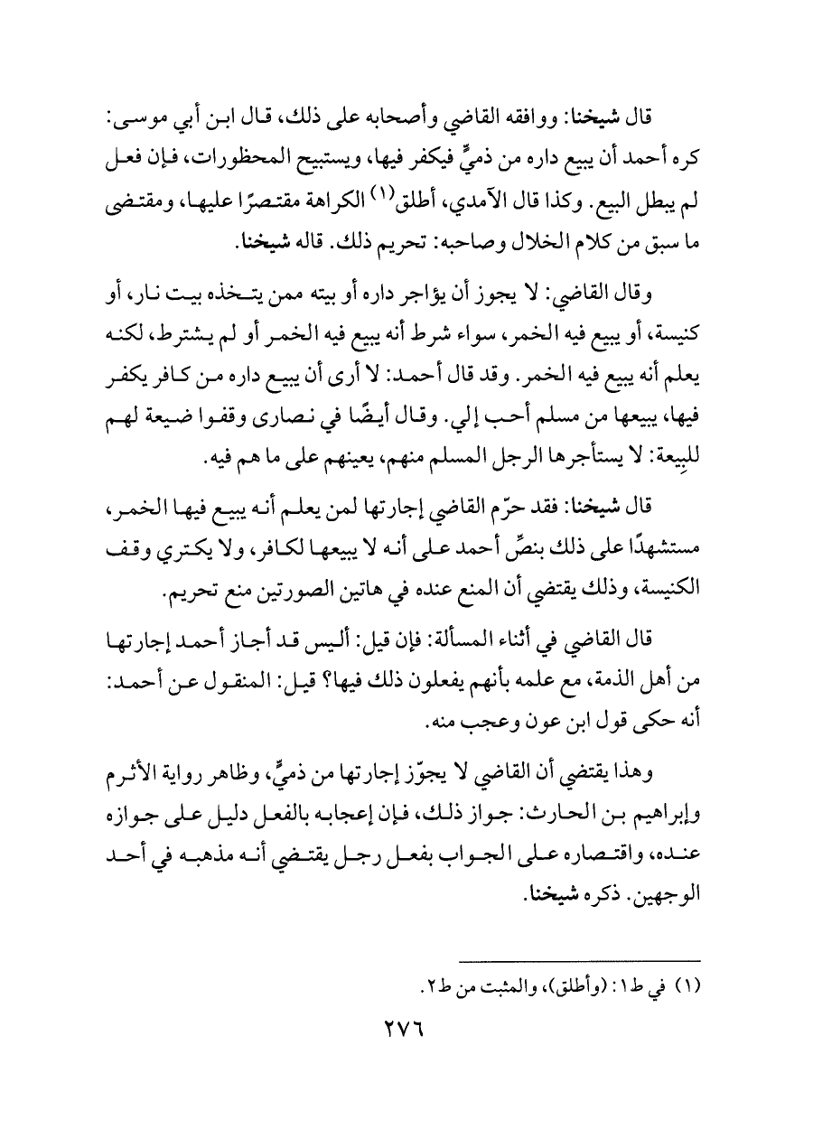 وقال القاضي: لا يجوز أن يؤاجر داره أو بيته ممن يتخذه بيت نار، أو كنيسة، أو يبيع فيه الخمر، سواء شرط أنه يبيع فيه الخمر أو لم يشترط، لكنه يعلم أنه يبيع فيه الخمر. وقد قال أحمد: لا أرى أن يبيع داره من كافر يكفر فيها، يبيعها من مسلم أحب إلي. وقال أيضًا في نصارى وقفوا ضيعة لهم للبِيعة: لا يستأجرها الرجل المسلم منهم، يعينهم على ما هم فيه.