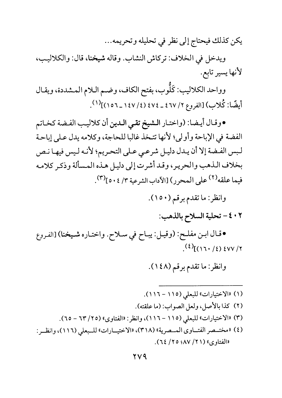- وقال أيضا: (واختار الشيخ تقي الدين أن كلاليب الفضة كخاتم الفضة في الإباحة وأولى؛ لأنها تتخذ غالبا للحاجة، وكلامه يدل على إباحة لبس الفضة إلا أن يدل دليل شرعي على التحريم؛ لأنه ليس فيها نص بخلاف الذهب والحرير، وقد أشرت إلى دليل هذه المسألة وذكر كلامه فيما علقه (¬٢) على المحرر) [الآداب الشرعية ٣/ ٥٠٤] (¬٣).