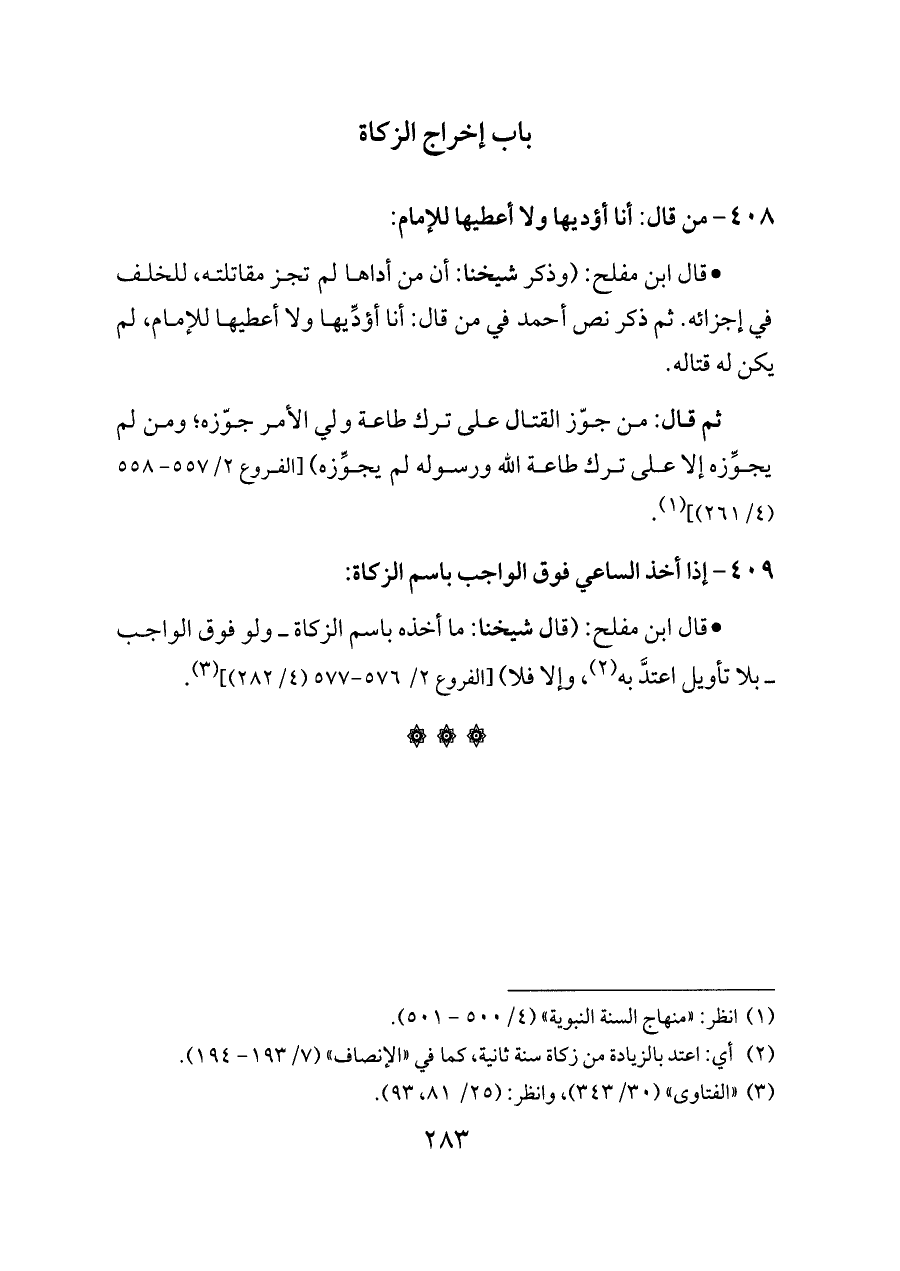 - قال ابن مفلح: (وذكر شيخنا: أن من أداها لم تجز مقاتلته، للخلف في إجزائه. ثم ذكر نص أحمد في من قال: أنا أؤدِّيها ولا أعطيها للإمام، لم يكن له قتاله.